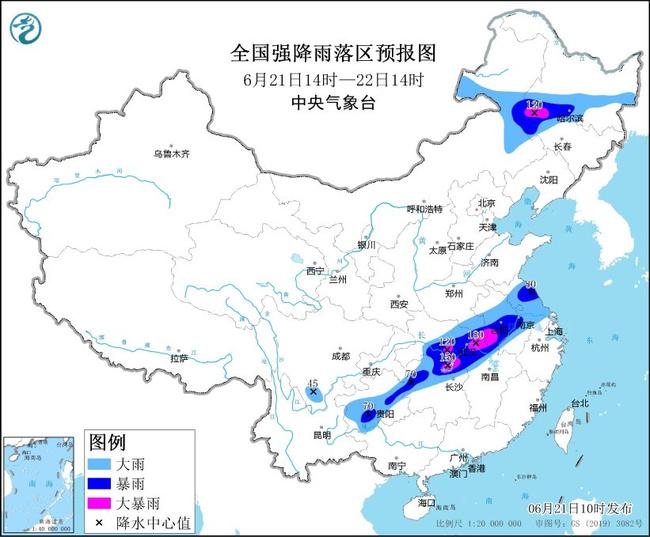 預(yù)計,6月21日14時至22日14時,貴州中南部、湖南北部、湖北東部和南部、河南東南部、江西西北部、安徽、江蘇以及內(nèi)蒙古東部、黑龍江南部、吉林西北部等地部分地區(qū)有大到暴雨,其中,安徽中部、湖北東部和南部、湖南東北部、內(nèi)蒙古東部、黑龍江西南部、吉林西北部等地局地有大暴雨(100~180毫米)。上述部分地區(qū)伴有短時強(qiáng)降水(最大小時降雨量30~50毫米,局地可超過80毫米),局地有雷暴大風(fēng)等強(qiáng)對流天氣。