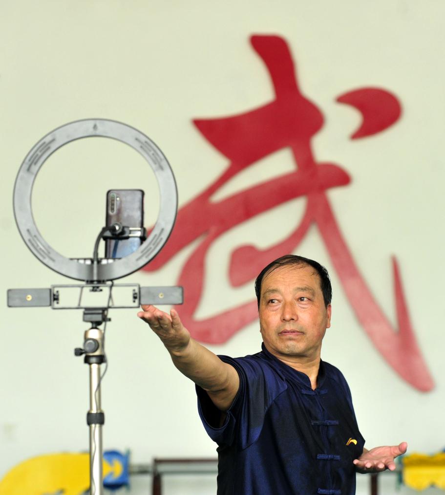 2017年6月17日,石同鼎(中)在泊頭六合武館內(nèi)教授小學(xué)生六合拳法。