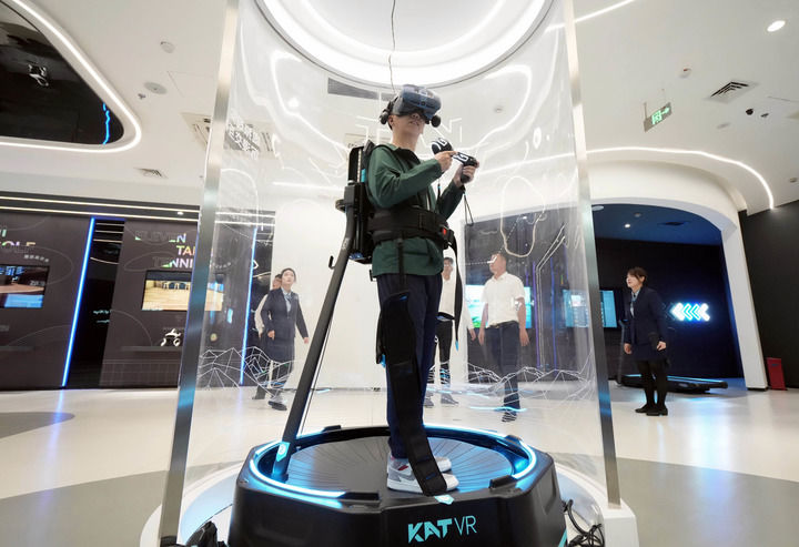 在位于江蘇蘇州昆山市的昆山元宇宙產(chǎn)業(yè)園元宇宙展示廳里,參觀者體驗VR游戲(6月1日攝)。新華社記者 李尕 攝