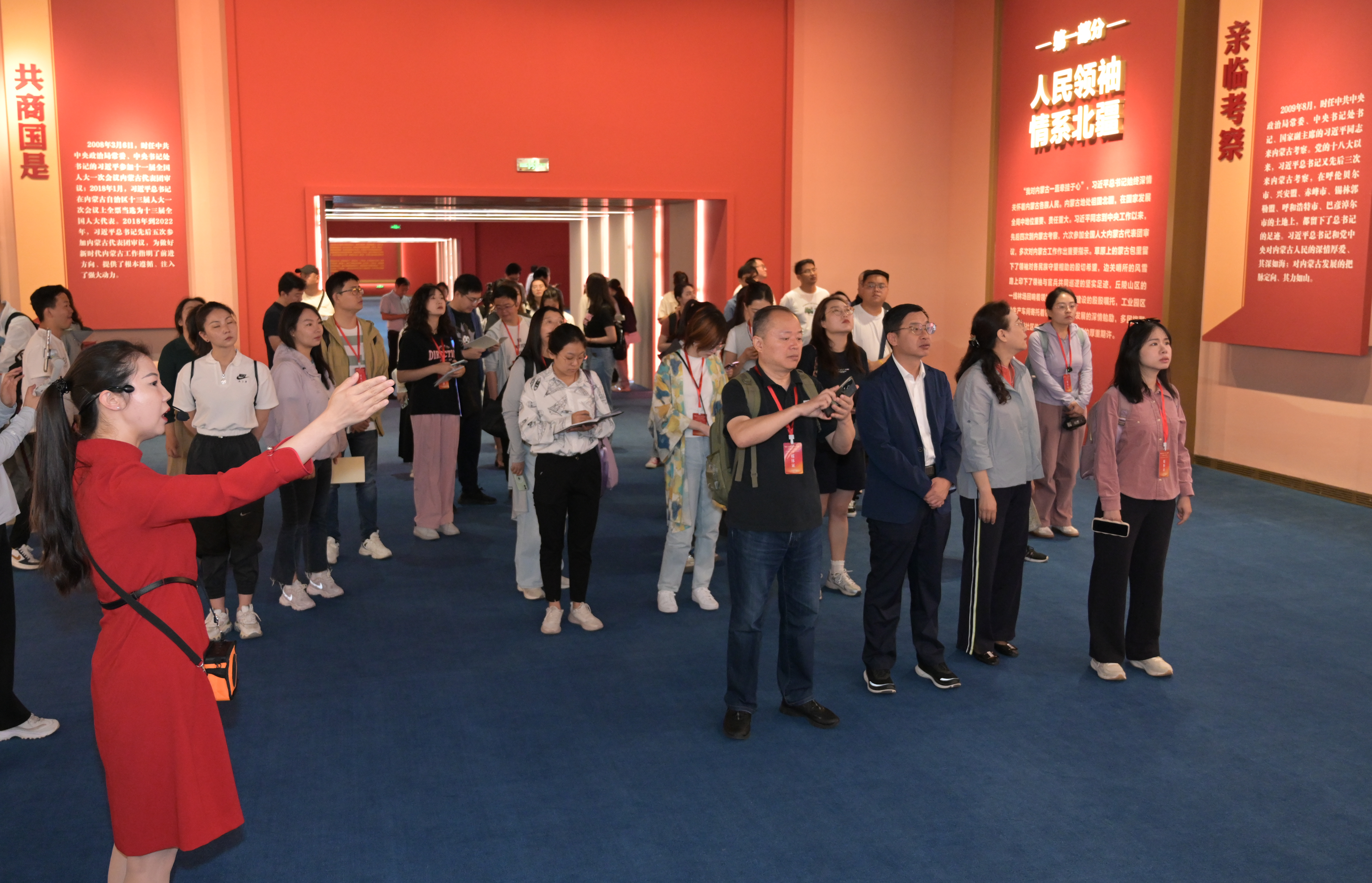 采訪團參觀“牢記囑托 感恩奮進”主題展。