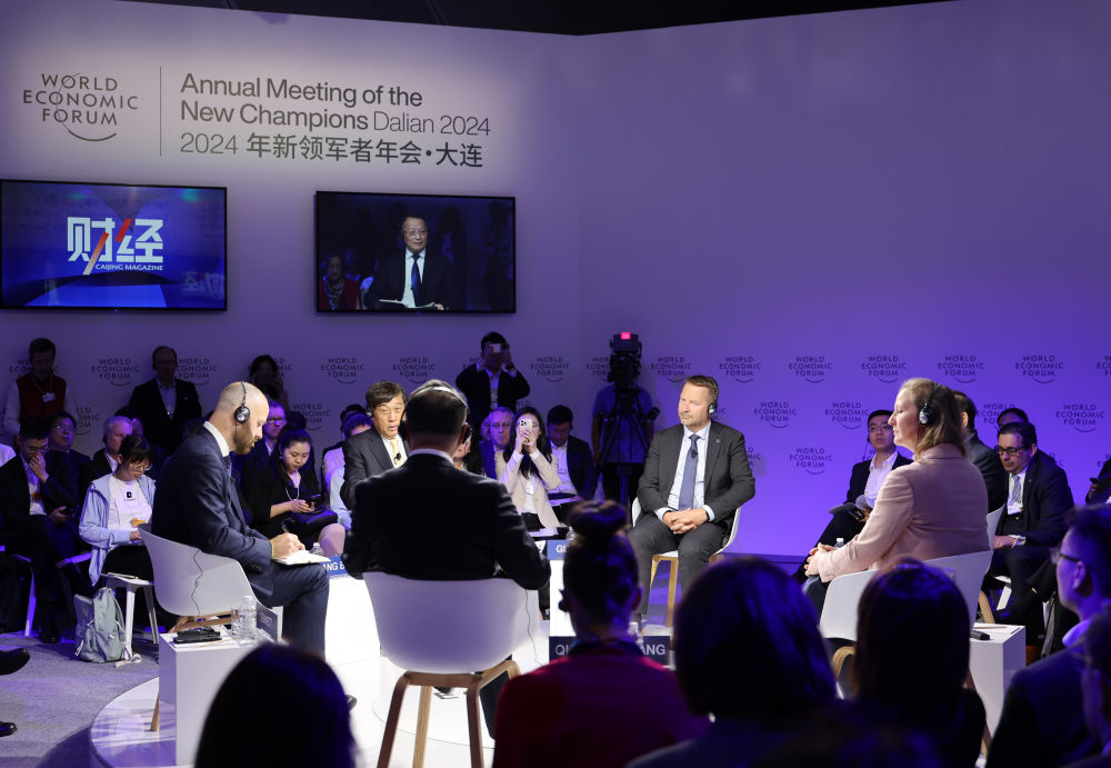 6月26日,在夏季達沃斯論壇主會場大連國際會議中心,嘉賓交流討論。新華社記者李鋼攝