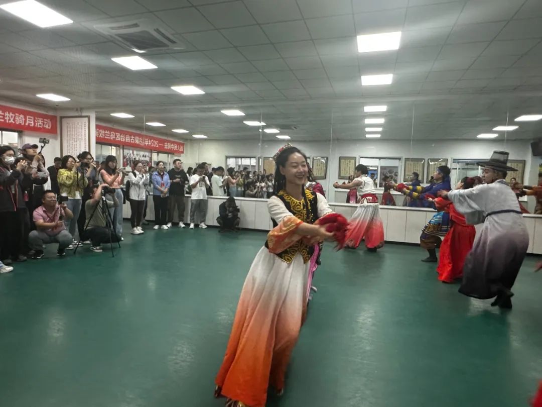 社區(qū)居民在烏蘭牧騎隊員指導下載歌載舞。