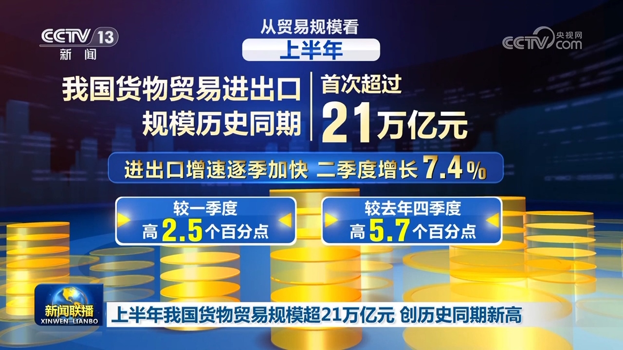 從貿(mào)易規(guī)???,上半年,我國貨物貿(mào)易進出口規(guī)模歷史同期首次超過21萬億元。進出口增速逐季加快,二季度增長7.4%,較一季度和去年四季度分別高2.5個、5.7個百分點,貨物貿(mào)易進出口質(zhì)量持續(xù)提升、規(guī)模較快增長。
