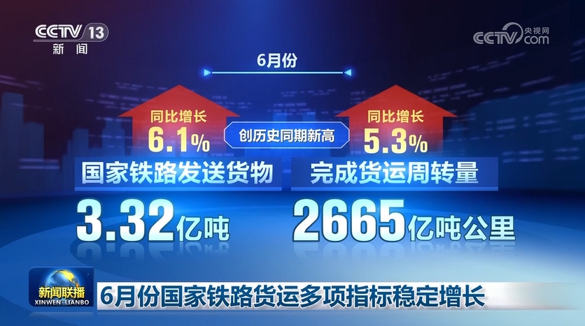 國鐵集團(tuán)數(shù)據(jù)顯示,6月份,國家鐵路發(fā)送貨物3.32億噸,完成貨運(yùn)周轉(zhuǎn)量2665億噸公里,同比分別增長6.1%、5.3%,創(chuàng)歷史同期新高。目前,我國鐵路貨運(yùn)量、貨運(yùn)周轉(zhuǎn)量等指標(biāo)穩(wěn)居世界首位。
