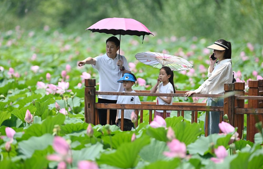 7月14日,人們在江蘇省泰州市天德湖公園荷花池賞荷游玩。新華社發(fā)(湯德宏攝)