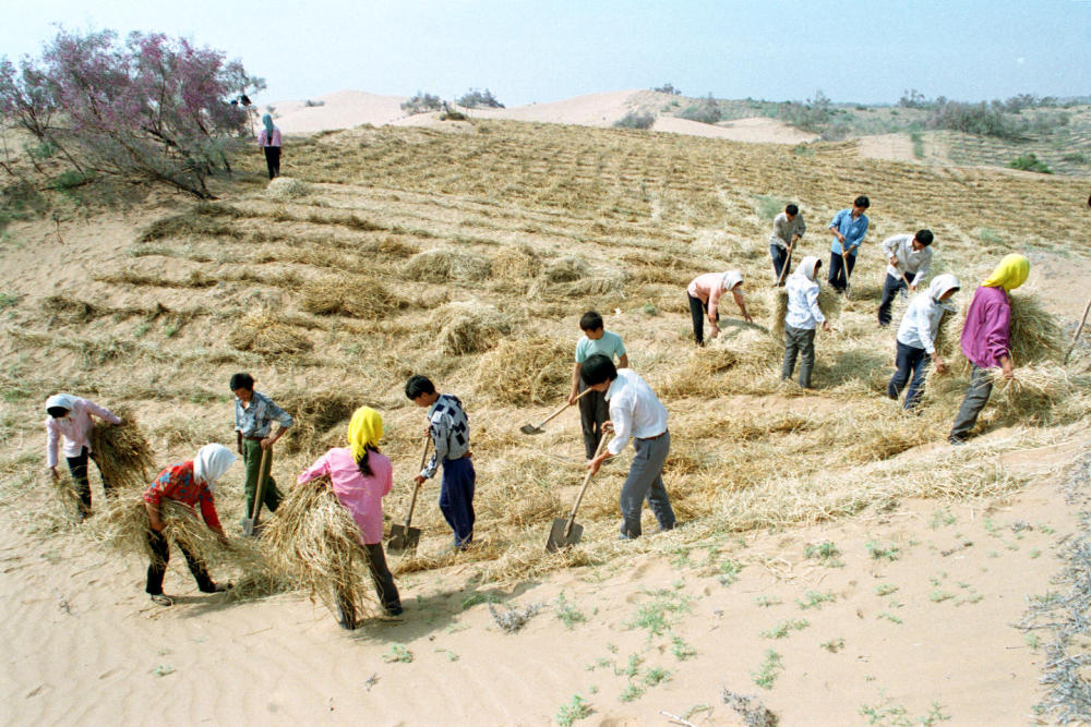 寧夏中衛(wèi)固沙林場職工在扎麥草方格(1994年9月24日攝)。新華社記者 劉海峰 攝