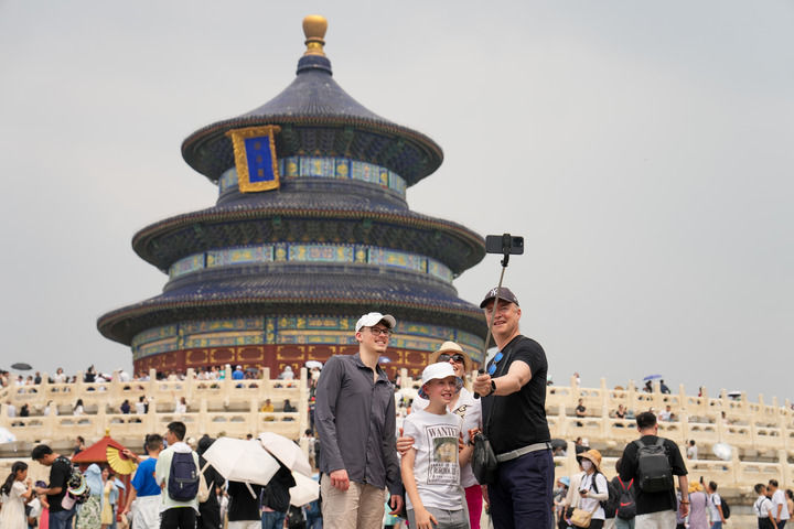 四名來自瑞士的游客在北京天壇公園祈年殿前合影(2024年7月9日攝)。