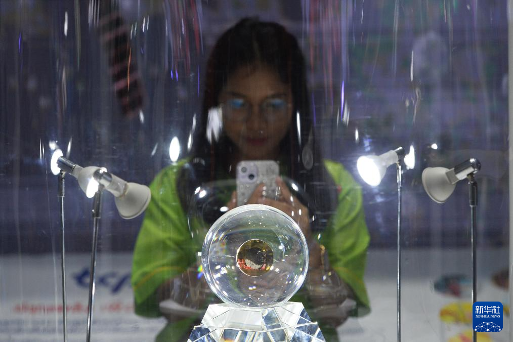 7月23日,一名女子在泰國曼谷舉行的“2024泰國未來科學(xué)力量展覽會”上拍攝展出的嫦娥五號月壤樣品。新華社發(fā)(拉亨攝)