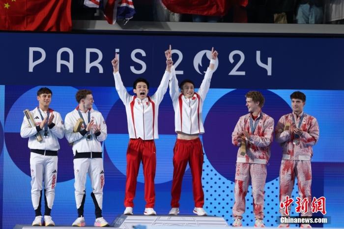 當(dāng)?shù)貢r(shí)間7月29日,在巴黎奧運(yùn)會(huì)跳水男子雙人十米臺(tái)決賽中,中國(guó)選手練俊杰/楊昊奪得金牌。圖為頒獎(jiǎng)儀式。中新社記者 富田 攝