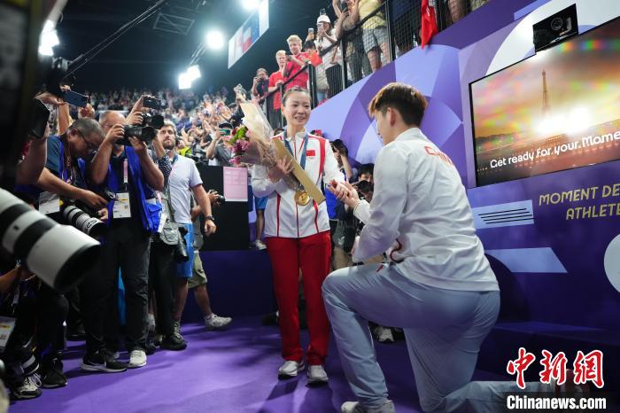 2016年里約奧運(yùn)會(huì),跳水女子三米板的頒獎(jiǎng)典禮后,跳水運(yùn)動(dòng)員秦凱向何姿求婚的場(chǎng)景曾感動(dòng)全球無(wú)數(shù)觀眾。巴黎奧運(yùn)會(huì)上,浪漫一刻再度上演。