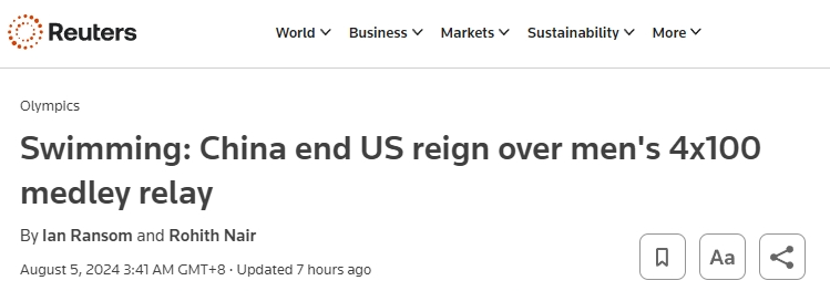 當(dāng)?shù)貢r(shí)間8月4日,在游泳男子4×100米混合泳接力中,中國(guó)隊(duì)反超該項(xiàng)目的奧運(yùn)“霸主”美國(guó)隊(duì)以及東道主法國(guó)隊(duì),以3分27秒46奪冠。英國(guó)路透社(Reuters)4日的報(bào)道中寫(xiě)道,現(xiàn)場(chǎng)歡呼聲震耳欲聾,中國(guó)隊(duì)的奪冠結(jié)束了美國(guó)隊(duì)64年來(lái)的不敗紀(jì)錄。賽后,美國(guó)選手萊恩·墨菲(Ryan Murphy)說(shuō):“今天中國(guó)隊(duì)的表現(xiàn)比我們要更好一些,向中國(guó)隊(duì)致敬,他們今晚的表現(xiàn)非常出色?!绷硪幻绹?guó)選手亨特·阿姆斯特朗(Hunter Armstrong)則關(guān)注到當(dāng)天是中國(guó)選手潘展樂(lè)的生日,他表示:“這對(duì)他來(lái)說(shuō)會(huì)是一份很酷的生日禮物!”