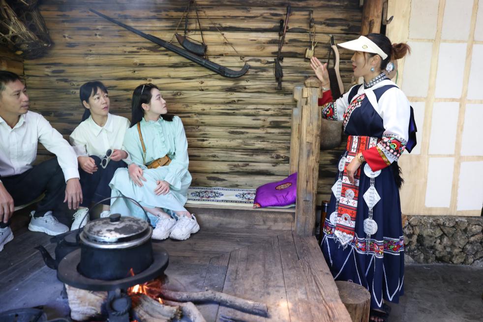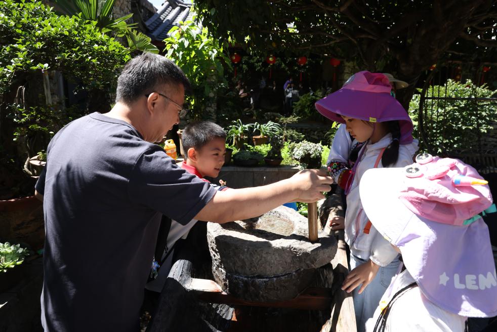 7月31日,廣西游客藍夢婷一家在麗江市玉龍納西族自治縣玉湖村的一處納西族村民家中體驗當(dāng)?shù)靥厣幕?。新華社記者 呂帥 攝
