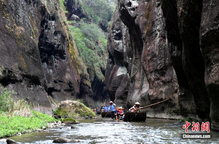 游客乘坐竹排在上清溪景區(qū)游玩。記者 呂明 攝
