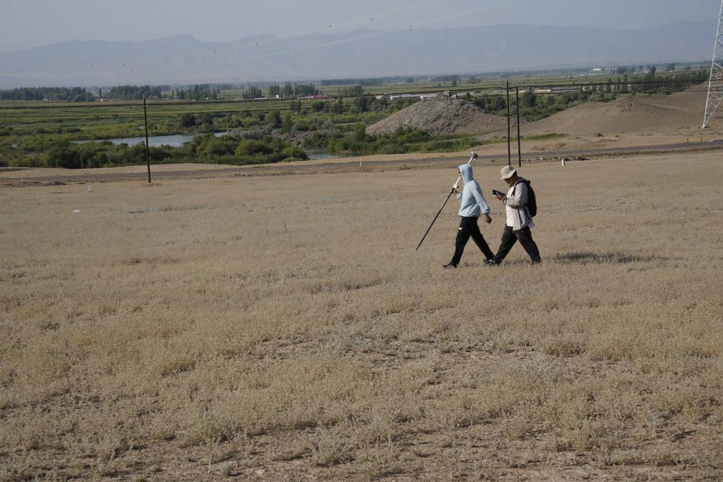 尼勒克縣第四次全國文物普查工作隊隊員魏中暢(左一)手持RTK測量儀,復核文物信息。新華社記者 白志強 攝
