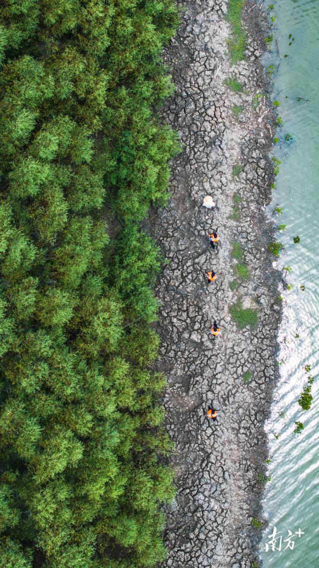說話間,大家伙各就各位、有序分工,拍照的拍照、記錄的記錄?!皹鋵殞殹迸浜系嘏排帕⒄陲L中“搖頭晃腦”。此時,“技術控”李明霖飛起一架無人機,從高空拍下“大合影”和視頻,解釋道:“后續(xù)還要比對片區(qū)紅樹林總體長勢變化?!?/strong>