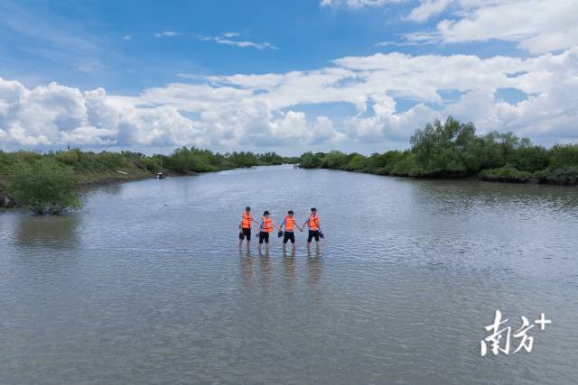 民警涉水前往麻章區(qū)湖光鎮(zhèn)料村一海邊養(yǎng)殖塘,查看紅樹林復種情況。