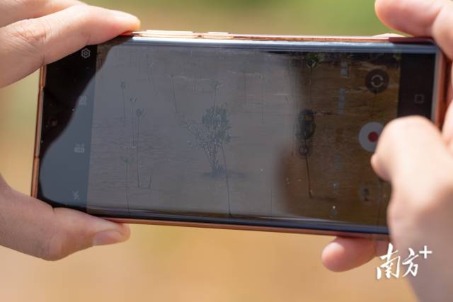 李明霖用手機拍下剛復種不久的“樹寶寶”。通過不同時間的影像對比,他們可以監(jiān)測紅樹林總體長勢。
