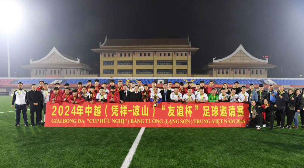2024年中越(憑祥-諒山)“友誼杯”足球邀請賽,賽后雙方隊(duì)員合影。(龐立堅(jiān) 攝)