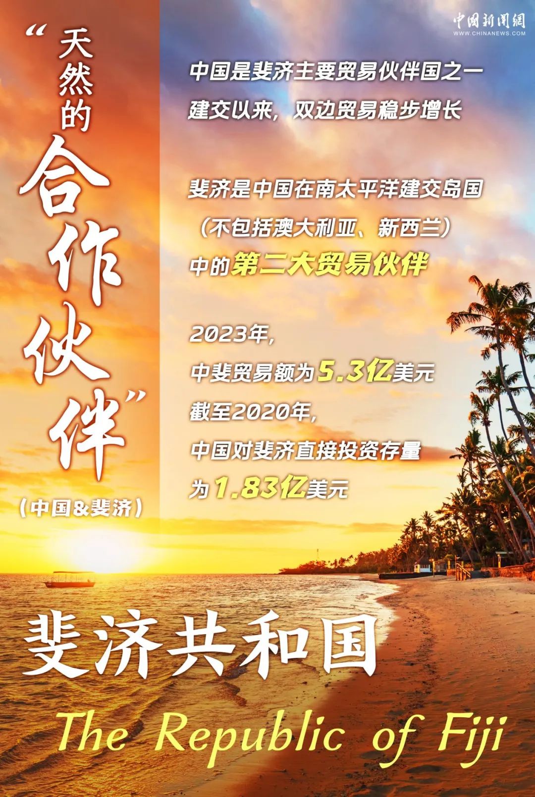 1975年11月5日,中國同斐濟建交。斐濟是太平洋島國中經(jīng)濟實力較強、經(jīng)濟發(fā)展較好的國家。建交以來,雙邊貿(mào)易穩(wěn)步增長。2023年,中斐貿(mào)易額為5.3億美元。