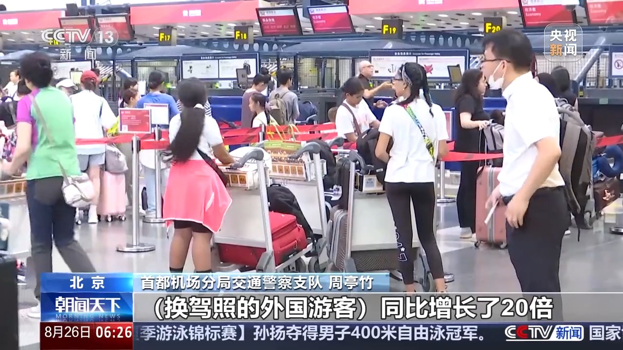 首都機(jī)場分局交通警察支隊(duì) 周亭竹:換駕照的外國游客同比要增長了20倍。中國的臨時駕駛許可,他只可以開租賃的汽車,私家車是不能開的,我們在窗口會提醒到他。