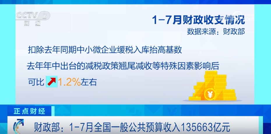 數(shù)據(jù)顯示,1—7月,全國一般公共預算收入135663億元,同比下降2.6%,扣除去年同期中小微企業(yè)緩稅入庫抬高基數(shù)、去年年中出臺的減稅政策翹尾減收等特殊因素影響后,可比增長1.2%左右。