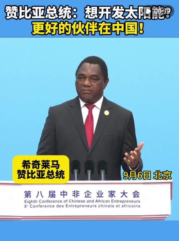 贊比亞總統(tǒng)希奇萊馬6日在第八屆中非企業(yè)家大會開幕式上稱贊中國技術,呼吁非中企業(yè)加強技術合作。誰是更好的能源領域合作伙伴?誰能提供最好的太陽能發(fā)電技術?他告訴非洲企業(yè)家:“那就是你們的中國同行!”