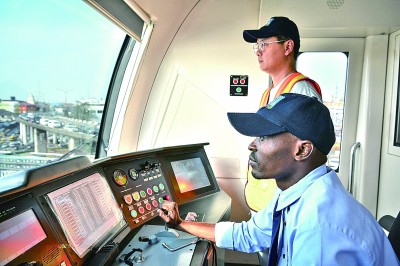 尼日利亞拉各斯,中國師傅指導(dǎo)當(dāng)?shù)匾娏?xí)司機(jī)駕駛中企承建的輕軌列車。新華社發(fā)