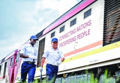 肯尼亞內(nèi)羅畢,中國火車駕駛員與當(dāng)?shù)貙W(xué)員從蒙內(nèi)鐵路機(jī)車旁走過。新華社發(fā)