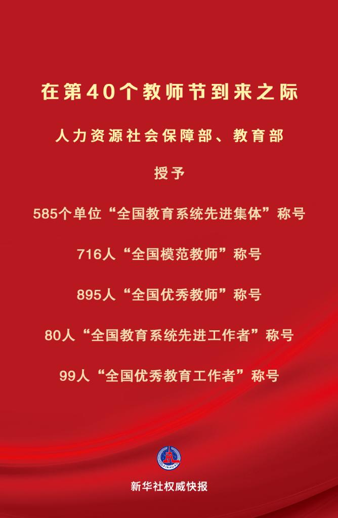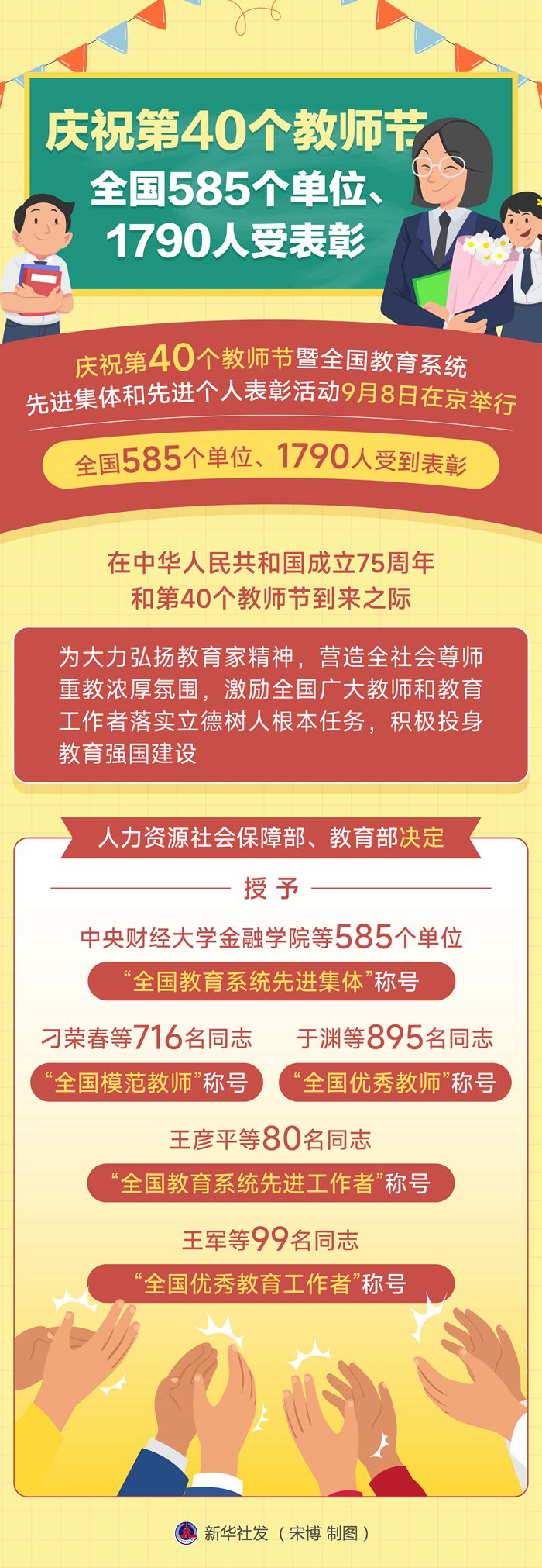 新華社北京9月8日電 慶祝第40個教師節(jié)暨全國教育系統(tǒng)先進(jìn)集體和先進(jìn)個人表彰活動8日在京舉行。全國585個單位、1790人受到表彰。