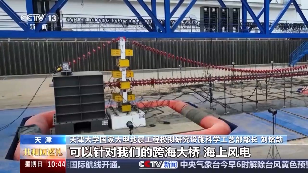 天津大學(xué)國家大型地震工程模擬研究設(shè)施科學(xué)工藝部部長 劉銘劼:我們這里面是世界上唯一的一套,可以實現(xiàn)水下雙臺地震、波浪、水流聯(lián)合模擬的一個試驗裝置,可以在3米水深下工作,可以針對我們的跨海大橋、海上風電這些海上“超級工程”進行更加真實的地震模擬研究。