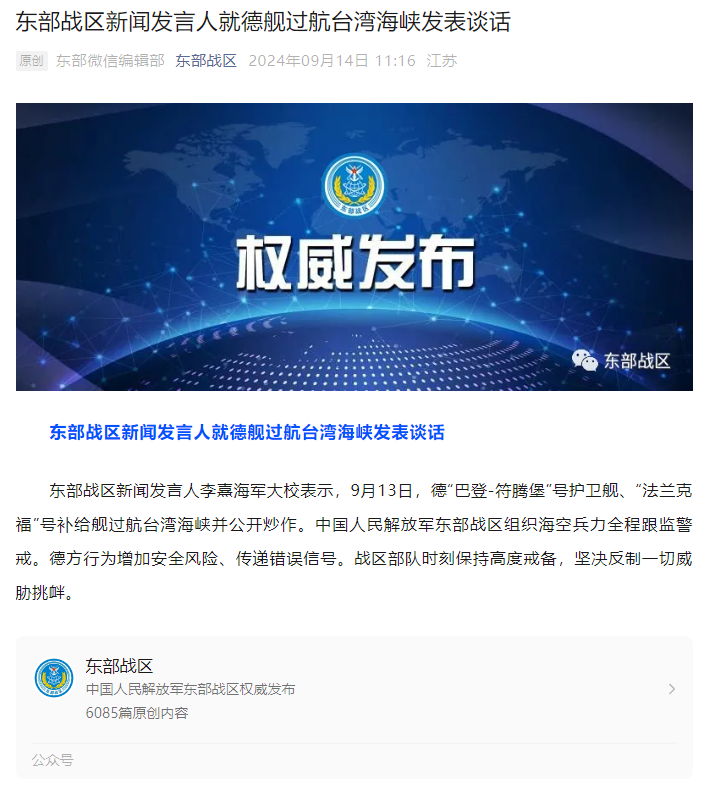 東部戰(zhàn)區(qū)新聞發(fā)言人李熹海軍大校表示,9月13日,德“巴登-符騰堡”號護(hù)衛(wèi)艦、“法蘭克福”號補(bǔ)給艦過航臺(tái)灣海峽并公開炒作。中國人民解放軍東部戰(zhàn)區(qū)組織??毡θ谈O(jiān)警戒。德方行為增加安全風(fēng)險(xiǎn)、傳遞錯(cuò)誤信號。戰(zhàn)區(qū)部隊(duì)時(shí)刻保持高度戒備,堅(jiān)決反制一切威脅挑釁。
