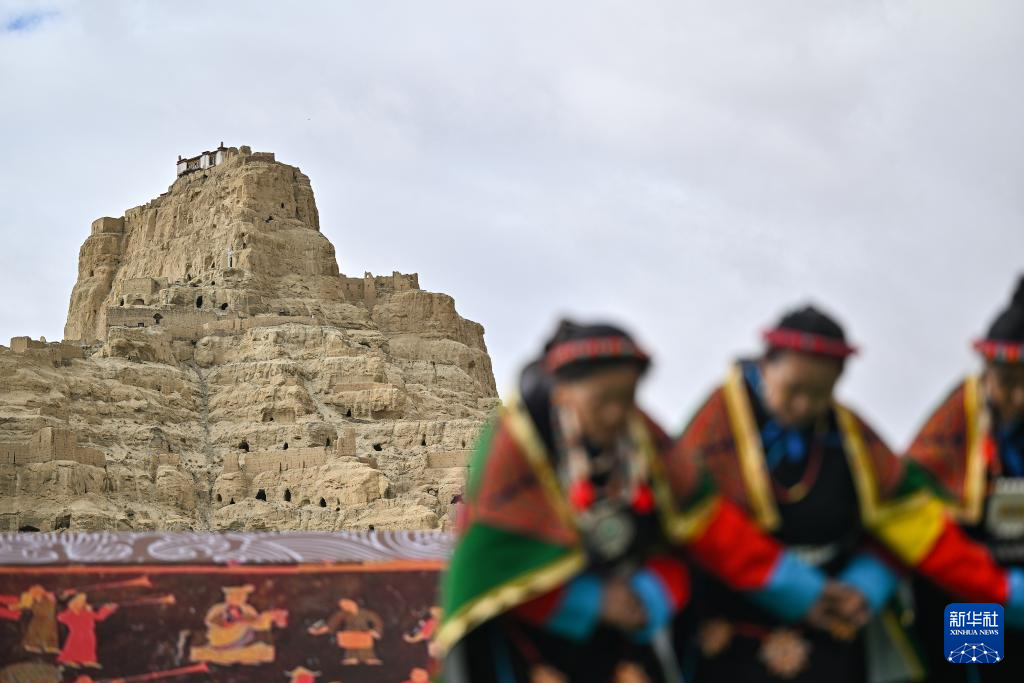在西藏阿里地區(qū)札達(dá)縣古格王國遺址腳下,自治區(qū)級“宣舞”非遺傳承人央金(右)介紹“宣舞”(9月11日攝)。