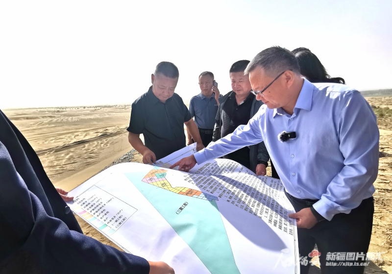 9月5日,民豐縣領(lǐng)導(dǎo)在治沙現(xiàn)場(chǎng)為記者介紹后河壩防沙治沙規(guī)劃。石榴云/新疆日?qǐng)?bào)記者 曹華攝