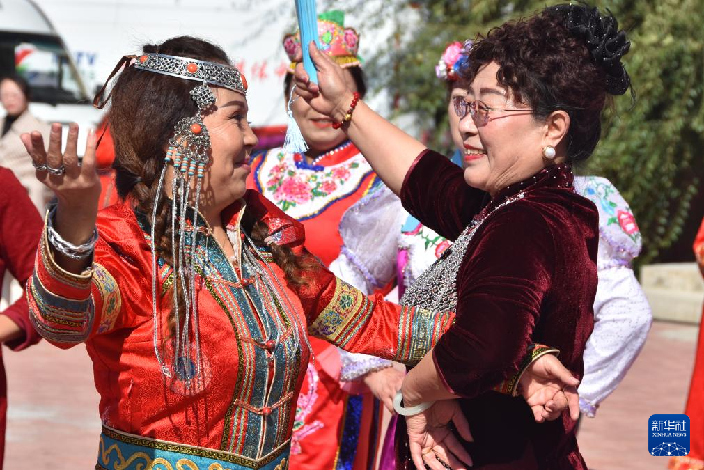 9月27日,在新疆塔城市新城街道哈爾墩社區(qū)舉行的“鄰里節(jié)百家宴”現(xiàn)場,社區(qū)居民在表演。