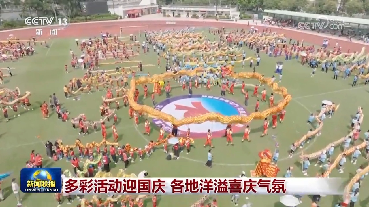 連日來,香港舉行多場(chǎng)活動(dòng)慶祝國(guó)慶。在新界屯門舉行的活動(dòng)中,近80所學(xué)校的師生們舞動(dòng)75只醒獅和180余條彩龍,展現(xiàn)愛國(guó)、愛港精神。在維多利亞港海濱舉行了千人大合唱活動(dòng)。