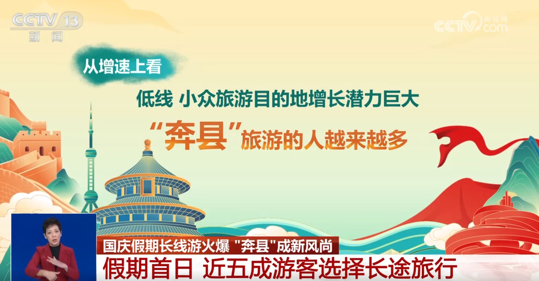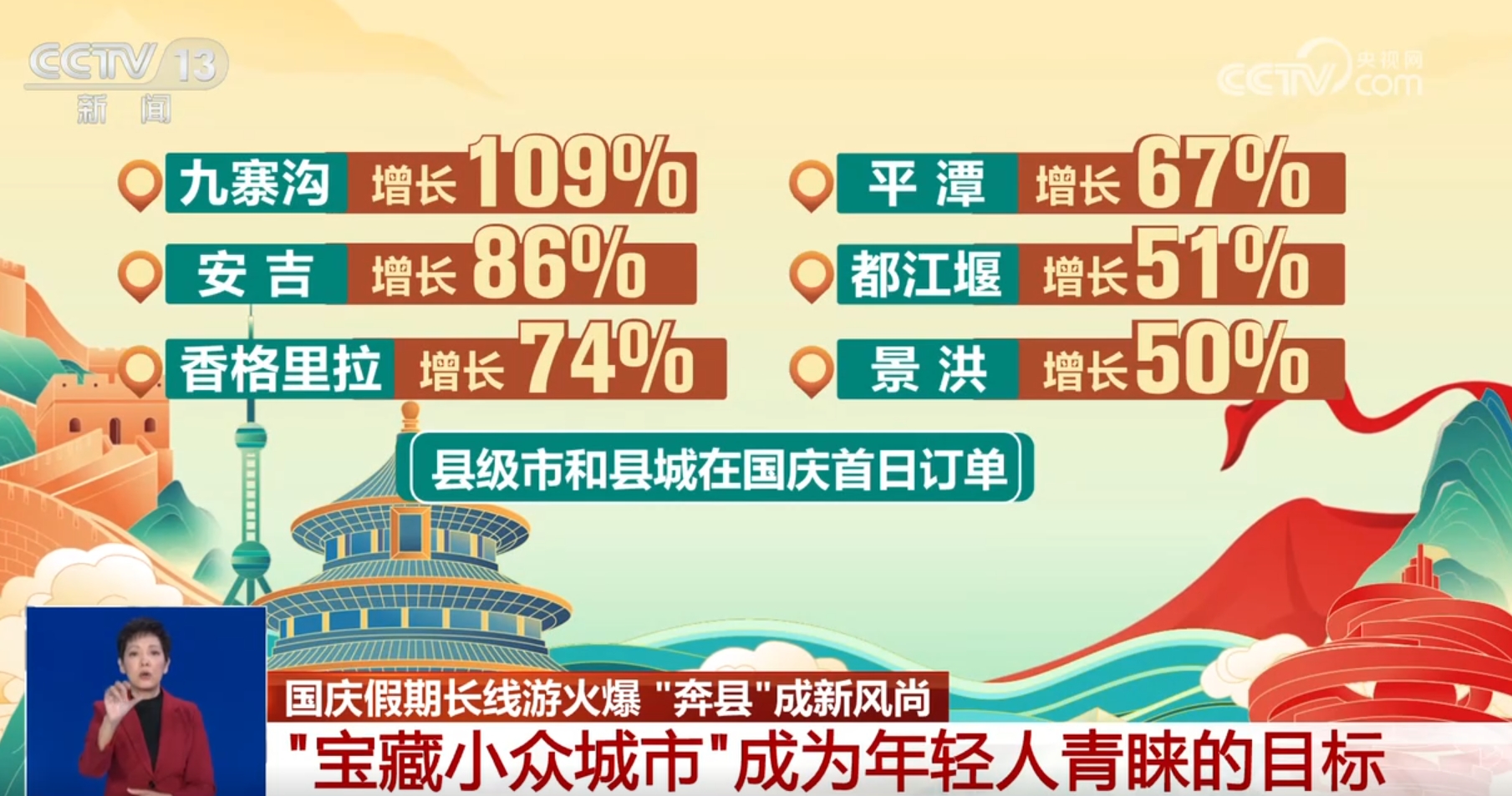 從增速上看,低線、小眾旅游目的地增長(zhǎng)潛力巨大,“奔縣”旅游的人越來越多。九寨溝、安吉、香格里拉、平潭、都江堰、景洪等縣級(jí)市和縣城在國(guó)慶首日都分別實(shí)現(xiàn)訂單109%、86%、74%、67%、51%、50%的增長(zhǎng)。