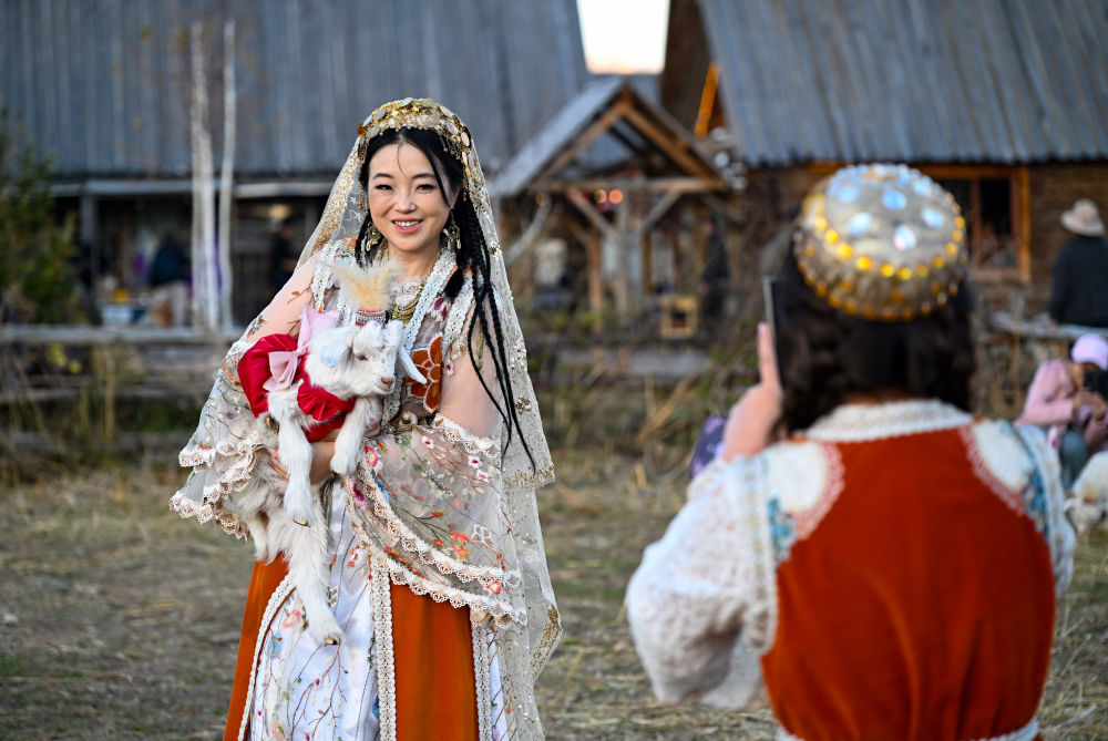 10月2日,游客在新疆阿勒泰禾木村打卡拍照。新華社記者陳朔 攝