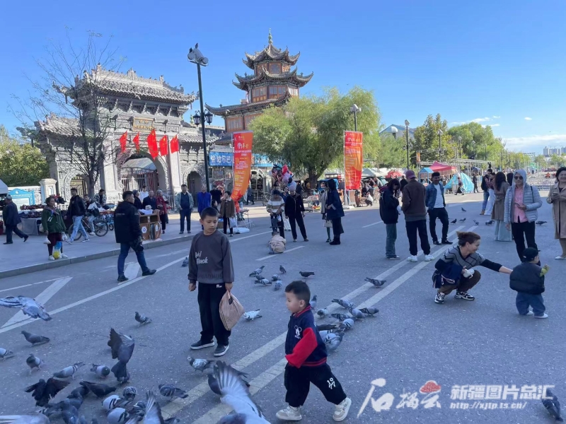 伊寧市喀贊其民俗旅游區(qū)游人與鴿子嬉戲。石榴云/新疆日報(bào)記者姚剛攝