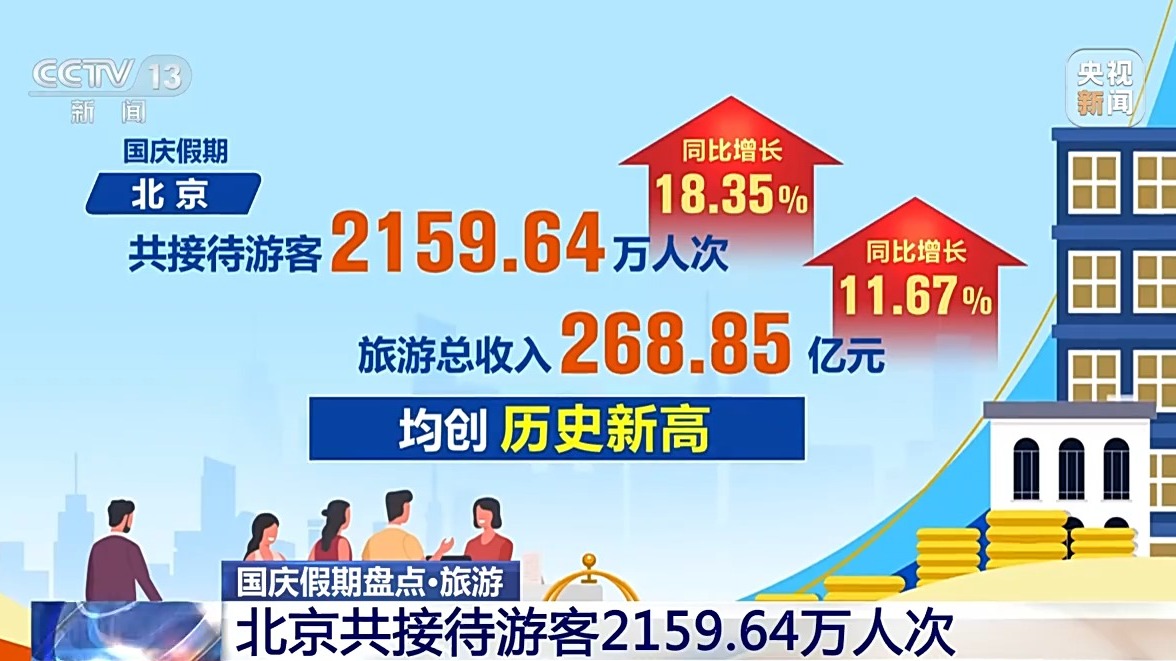 統(tǒng)計數(shù)據(jù)顯示,國慶假期,北京共接待游客2159.64萬人次,同比增長18.35%;旅游總收入268.85億元,同比增長11.67%,均創(chuàng)歷史新高。文博游、北京中軸線游、京郊游、微度假游、體育賽事游、特色商圈文化街區(qū)游、花燈游、網(wǎng)紅潮玩打卡地游等受到游客青睞。