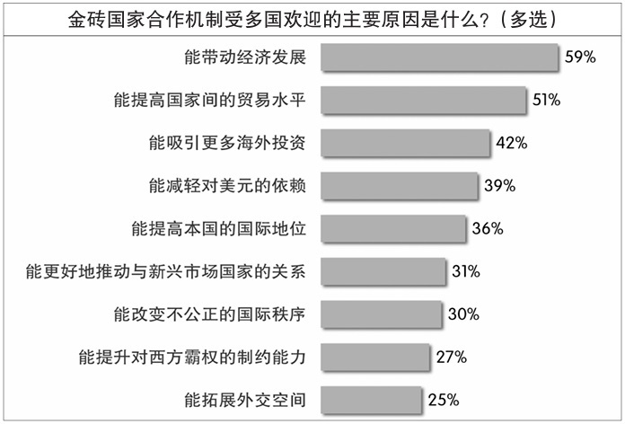 在12國受訪者看來,金磚機制受多國歡迎的最主要原因是它“能帶動經(jīng)濟發(fā)展”,有近六成受訪者認同此原因。過半受訪者認為,“能提高國家間的貿(mào)易水平”是金磚機制受歡迎的原因。此外,能“吸引更多海外投資”“減輕對美元的依賴”“提高本國國際地位”等原因也獲得較多認同。王友明對《環(huán)球時報》記者分析說:“開放、包容、合作、共贏的精神是金磚國家能夠走向‘大金磚’的根本原因,這四個要素缺一不可?!?/p>