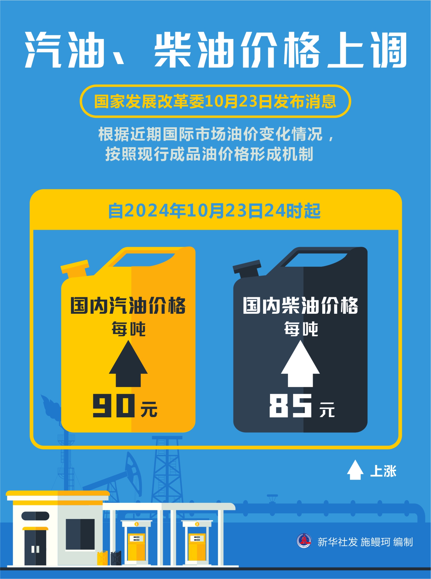 國家發(fā)展改革委23日發(fā)布消息,根據(jù)近期國際市場(chǎng)油價(jià)變化情況,按照現(xiàn)行成品油價(jià)格形成機(jī)制,自2024年10月23日24時(shí)起,國內(nèi)汽、柴油價(jià)格每噸分別上漲90元和85元。