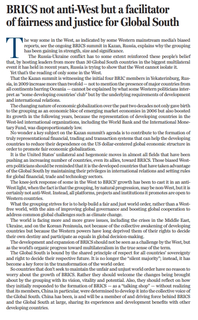 原標(biāo)題:BRICS not anti-West but a facilitator of fairness and justice for Global South