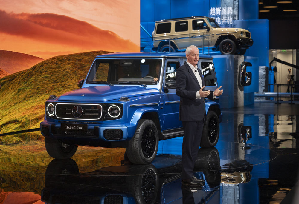 2024年4月25日,在北京中國國際展覽中心順義館舉行的2024北京車展上,梅賽德斯—奔馳集團(tuán)股份公司董事會成員唐仕凱介紹梅賽德斯—奔馳純電G級越野車。新華社記者才揚攝