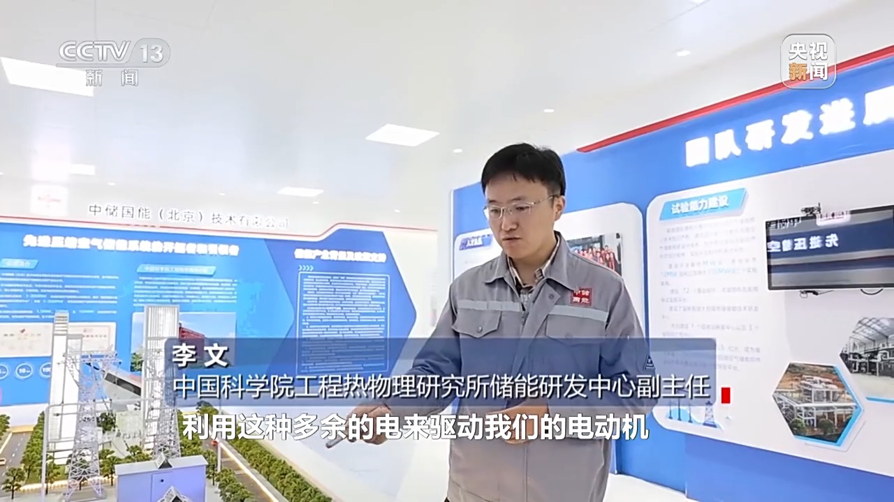 中國科學(xué)院工程熱物理研究所儲能研發(fā)中心副主任 李文:利用多余的電來驅(qū)動電動機,帶動壓縮機把空氣壓縮到高壓狀態(tài),最后存儲到儲氣裝置中,在有需要的時候,我們利用所存儲的高壓空氣來驅(qū)動膨脹機,帶動發(fā)電機進行做功發(fā)電。