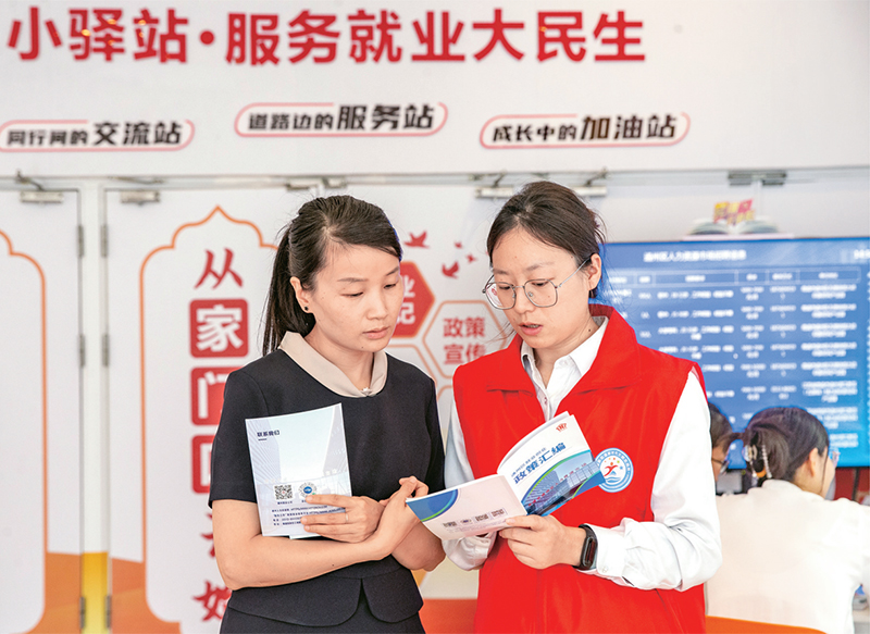 零工市場是向靈活就業(yè)人員與用工主體提供就業(yè)服務(wù)的重要載體。圖為2024年9月3日,江蘇省南通市通州區(qū)萬達廣場“零工驛站”內(nèi),就業(yè)服務(wù)人員在向求職者介紹就業(yè)創(chuàng)業(yè)政策。人民圖片 翟慧勇/攝