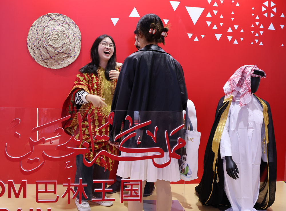 11月5日,參會(huì)者在第七屆進(jìn)博會(huì)國(guó)家展巴林館試穿巴林服裝。新華社記者 殷剛 攝
