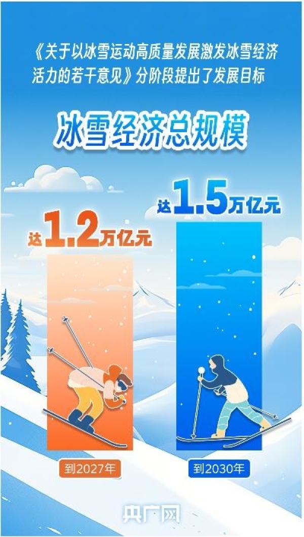 近日,國務(wù)院辦公廳公開發(fā)布《關(guān)于以冰雪運(yùn)動高質(zhì)量發(fā)展激發(fā)冰雪經(jīng)濟(jì)活力的若干意見》(以下簡稱《意見》),分階段提出發(fā)展目標(biāo):到2027年,冰雪運(yùn)動場地設(shè)施更加完善,服務(wù)水平顯著提升,冰雪運(yùn)動更加廣泛開展,冰雪經(jīng)濟(jì)總規(guī)模達(dá)1.2萬億元。到2030年,冰雪經(jīng)濟(jì)主要產(chǎn)業(yè)鏈條實(shí)現(xiàn)高水平協(xié)調(diào)融合發(fā)展,冰雪消費(fèi)成為擴(kuò)大內(nèi)需的重要增長點(diǎn),冰雪經(jīng)濟(jì)總規(guī)模達(dá)1.5萬億元。