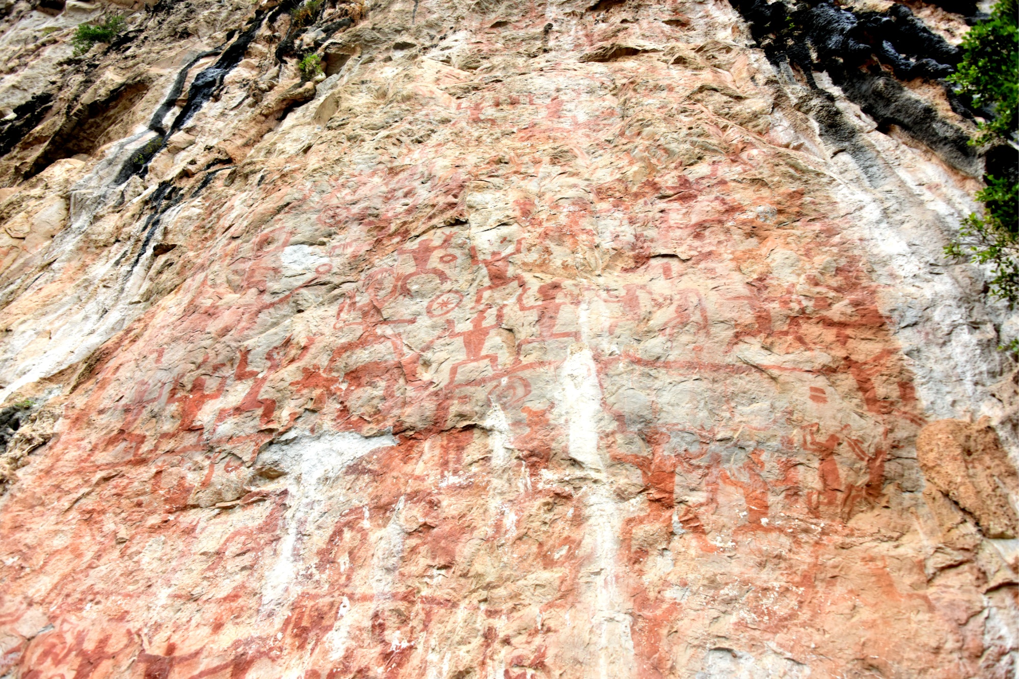 花山,坐落于崇左市寧明縣城西北約25公里的明江河畔,以其古老神奇的巖畫而聞名海內(nèi)外。花山巖畫距今已有2000多年的歷史,刻著人、獸、銅鼓、刀劍、羊角鈕鐘等造型各異的赭紅色圖像,記錄著壯族先民古駱越人的生活、生產(chǎn)和宗教信仰,為中國首個(gè)巖畫類世界文化遺產(chǎn)。