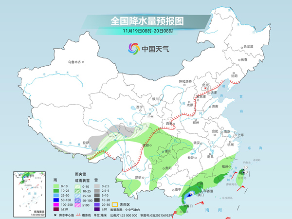 后天,新疆南疆西部山區(qū)、青海東部和南部、甘肅南部、川西高原北部、西藏東部和南部等地部分地區(qū)有小雪或雨夾雪。廣東大部、廣西東部、海南島東部、云南中南部、臺灣島北部等地部分地區(qū)有中到大雨,其中,廣西東部、廣東西南部等地部分地區(qū)有暴雨。