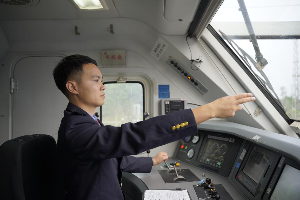 作為第10萬(wàn)列中歐班列的駕駛員,李峰穩(wěn)步登上駕駛室,緩解制動(dòng)機(jī)、推動(dòng)前進(jìn)手柄……熟練地完成一系列發(fā)車前準(zhǔn)備工作,列車緩緩啟動(dòng)。